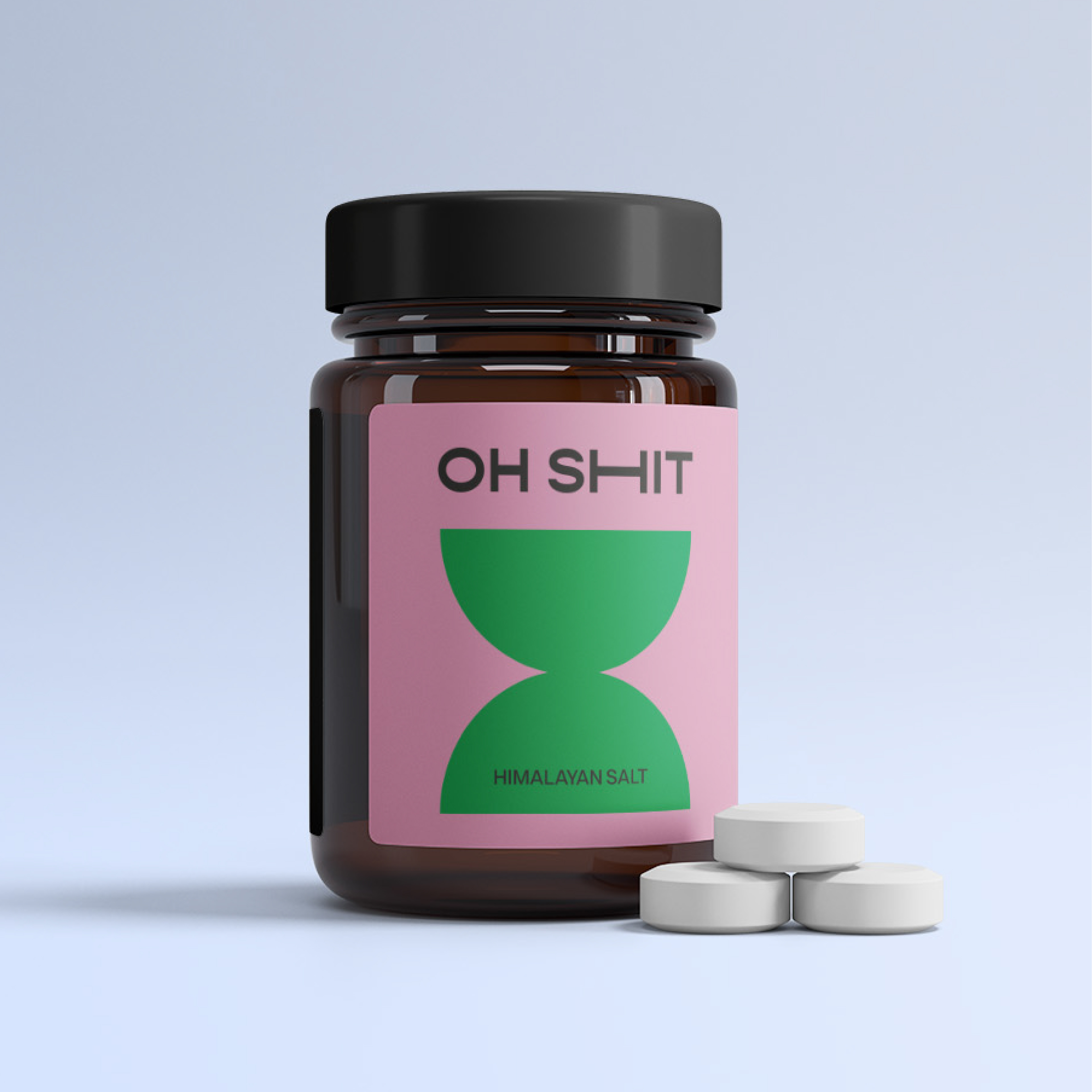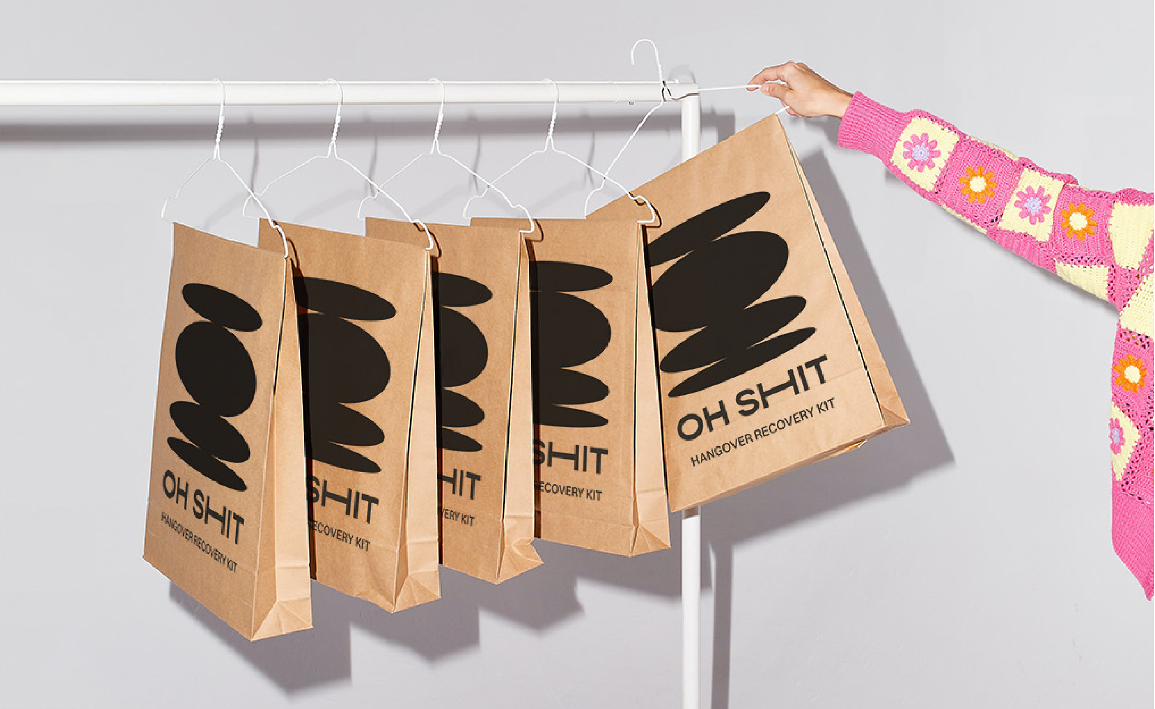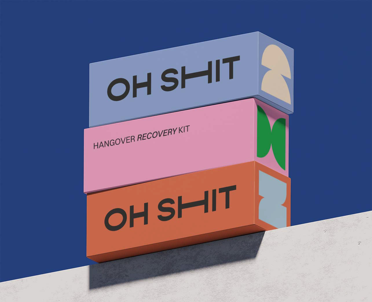 Visual identity and packaging for 'OH SHIT' the hangover recovery kit that uses natural remedies to reduce the rough next day feeling. A playful but clean design to reflect a playful but researched product.